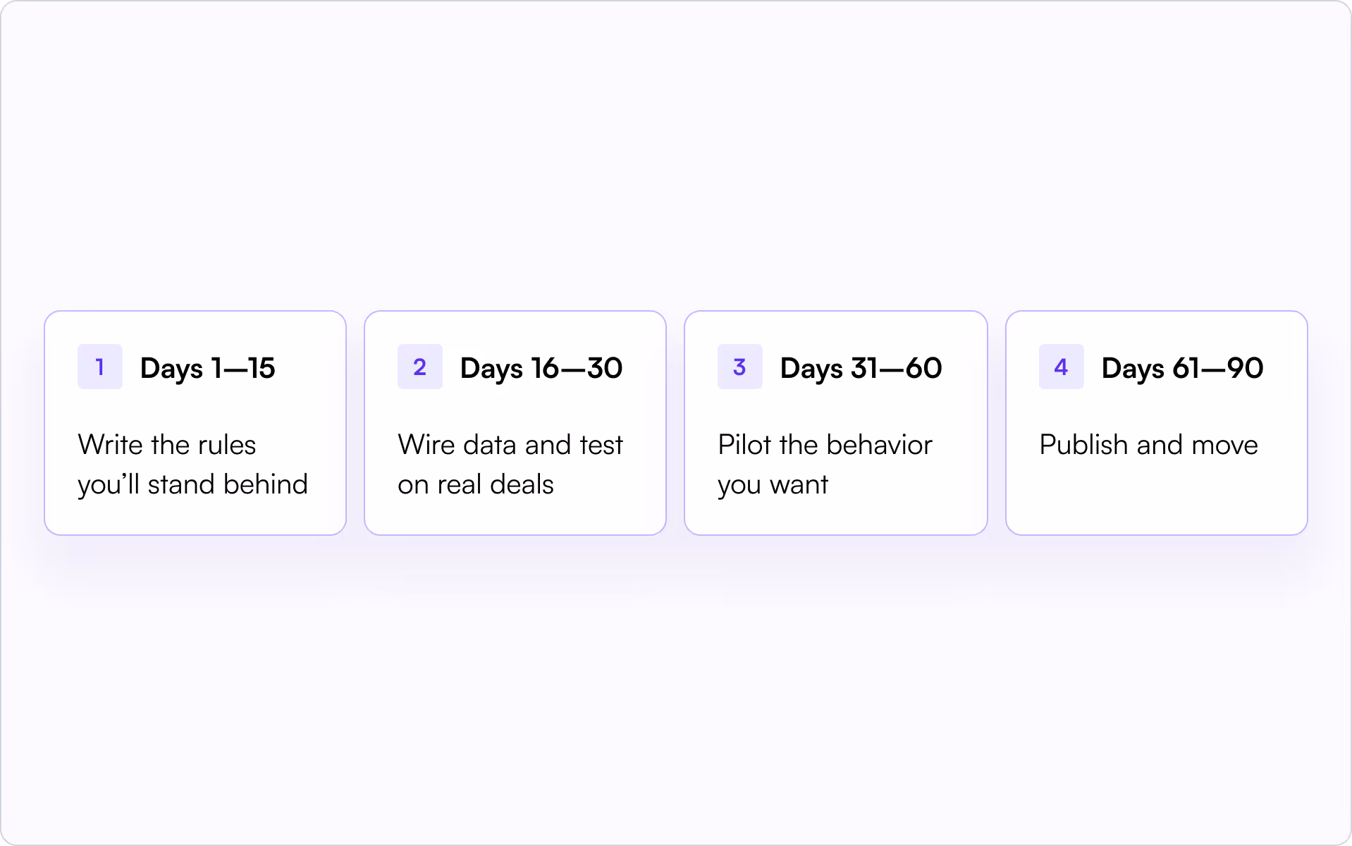 To keep the flow simple, build the tiers and roll them out in one 90-day track. You’re writing rules, wiring data, proving behavior, and then publishing with confidence — all without derailing day jobs.