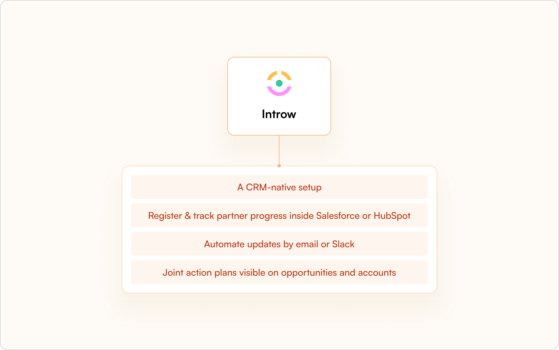 Spreadsheets and email threads might work for 5 partners — not 50. Introw gives you the automation, real-time insights, and CRM-native experience needed to grow your program without adding headcount.