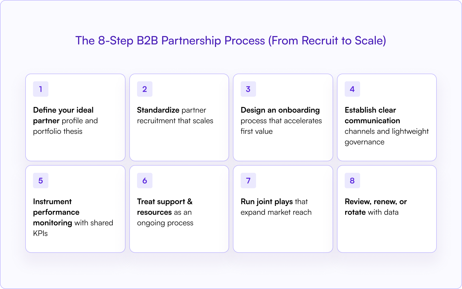 A successful SaaS partner program follows a repeatable, structured journey. Here's how you scale from one partner to hundreds, without losing quality, engagement, or results: