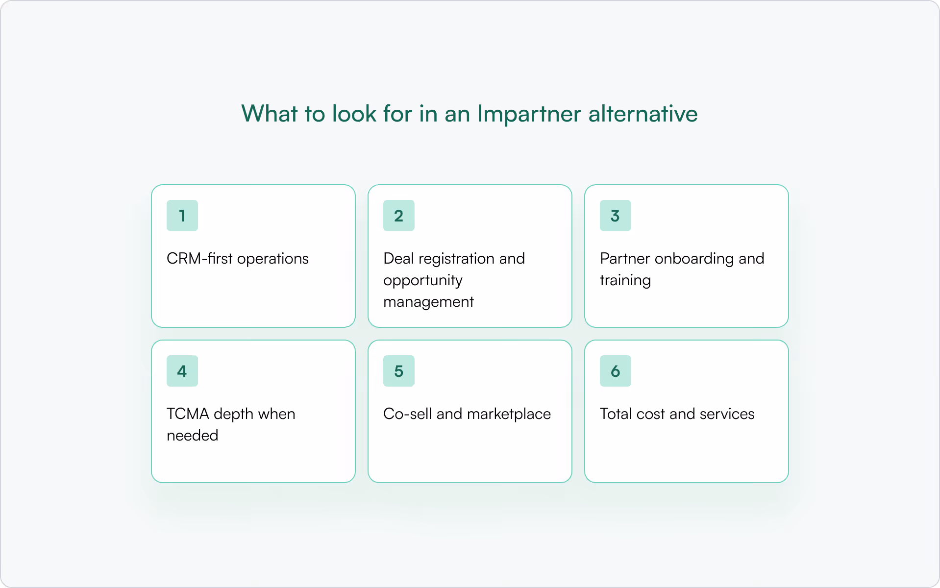 Let's start with an obvious question - why teams look beyond Impartner? Impartner is a leading partner relationship management and TCMA provider and remains popular with enterprise programs that need MDF, incentives, and a full management system for partner relationships. Still, many companies assess Impartner competitors to find a better fit for HubSpot coexistence, speed of deployment, lighter admin overhead, or specialized motions like hyperscaler co selling, affiliate partnerships, and marketplace listings.