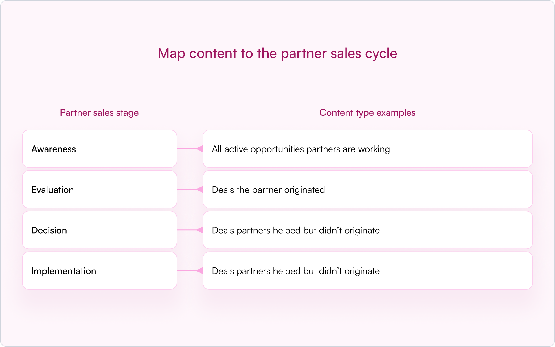 Also consider your partner model. Referral, reseller, and systems integrator motions typically need different content at each stage.