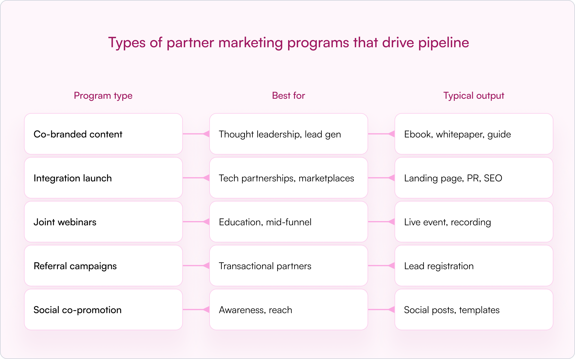 Early-stage teams usually win with campaigns that are fast to launch and easy to repeat: Integration launch pages (compounding SEO value) Co-hosted webinars (shared audience and lead capture) Referral motions (direct pipeline linkage) Co-branded “how-to” guides (evergreen content you can reuse in sales) The key is choosing one format you can run monthly, then building templates so it becomes a system — not a scramble.