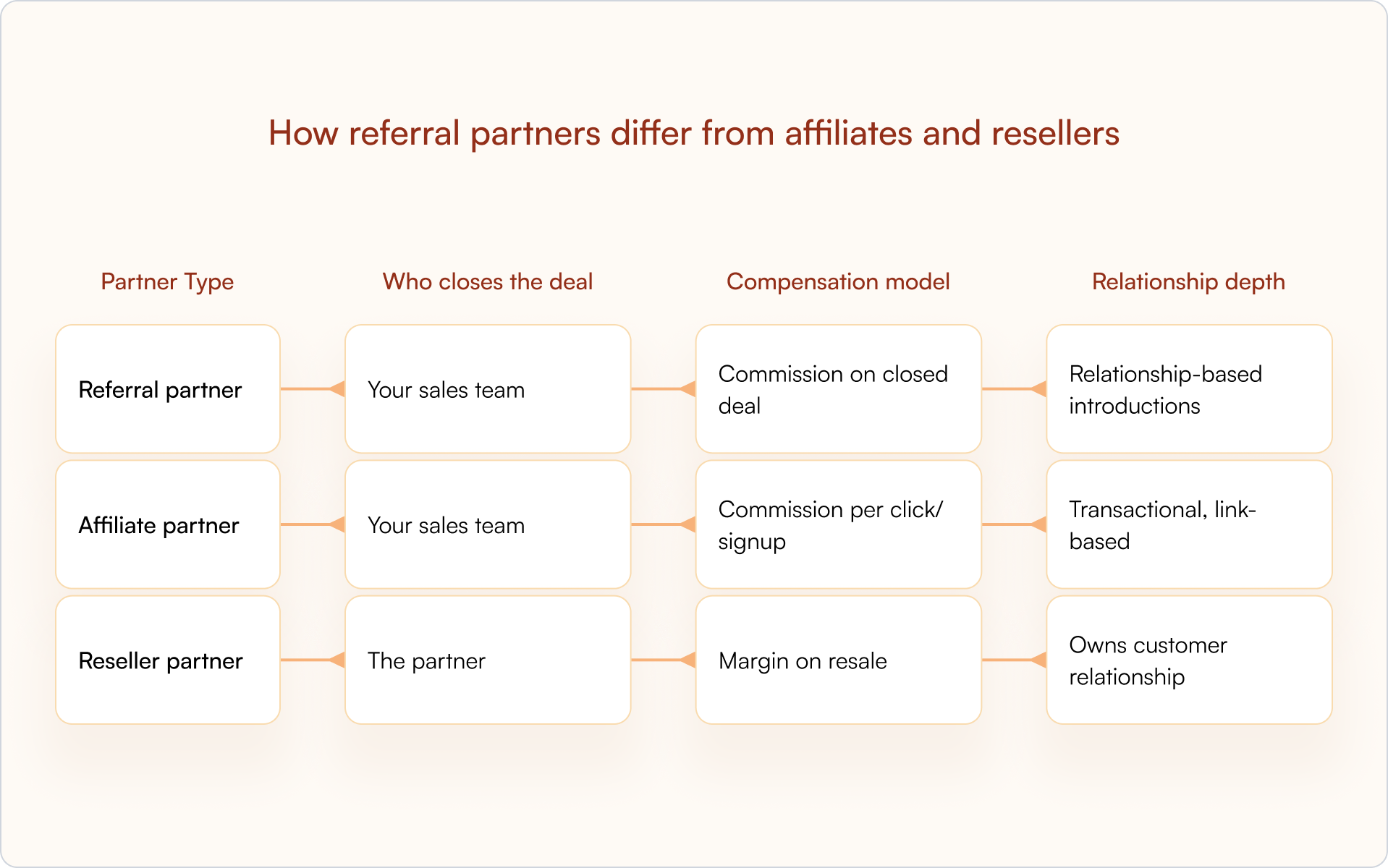 Unlike affiliate programs that rely on tracking links and high-volume marketing, referral partnerships are built for high-consideration B2B sales. Partners identify strong-fit prospects and make warm introductions, then your sales team runs the sales cycle.