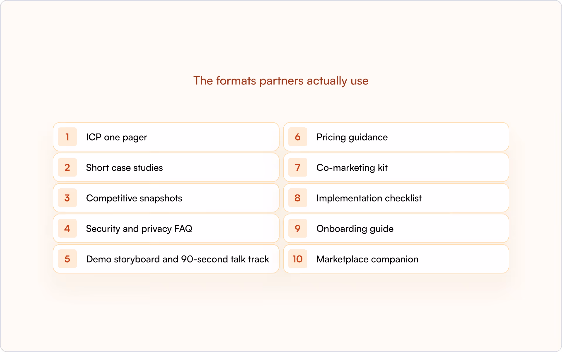 If you’re prioritizing what to build first, start here. Partners ask for enablement content early because it supports deals they’re already working.