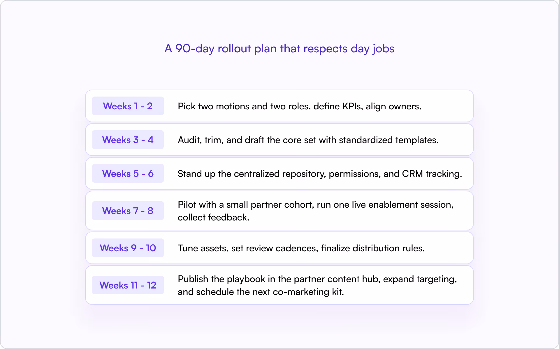 Campaign kits bundle everything a partner needs to run a campaign: email sequences, social copy, landing pages, and sometimes ad creative. Playbooks provide step-by-step guidance on how to deploy those kits.