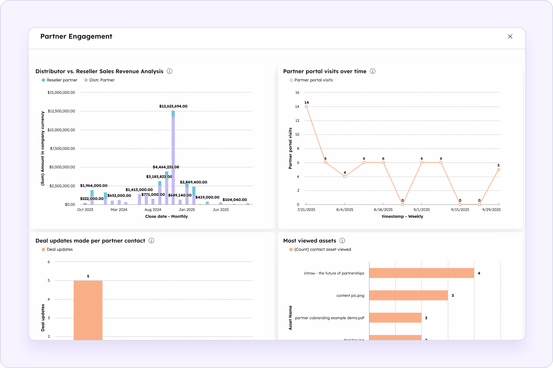 - Activity over time: trends that spotlight highly active (and at‑risk) partners.