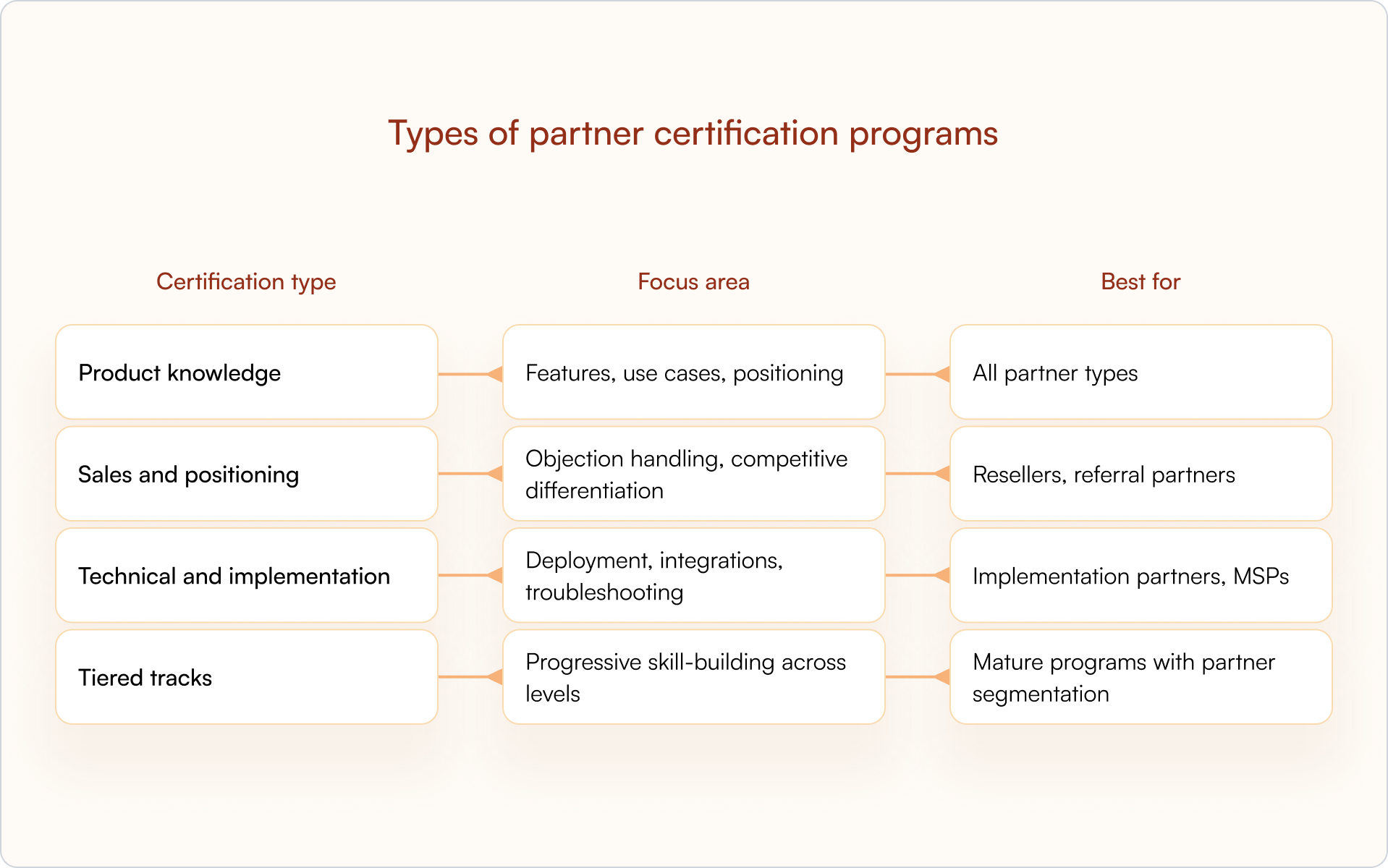 Not every partner needs the same training. A referral partner introducing leads needs positioning basics. A reseller closing deals needs pricing, objection handling, and competitive differentiation. An implementation partner deploying your product needs technical depth.