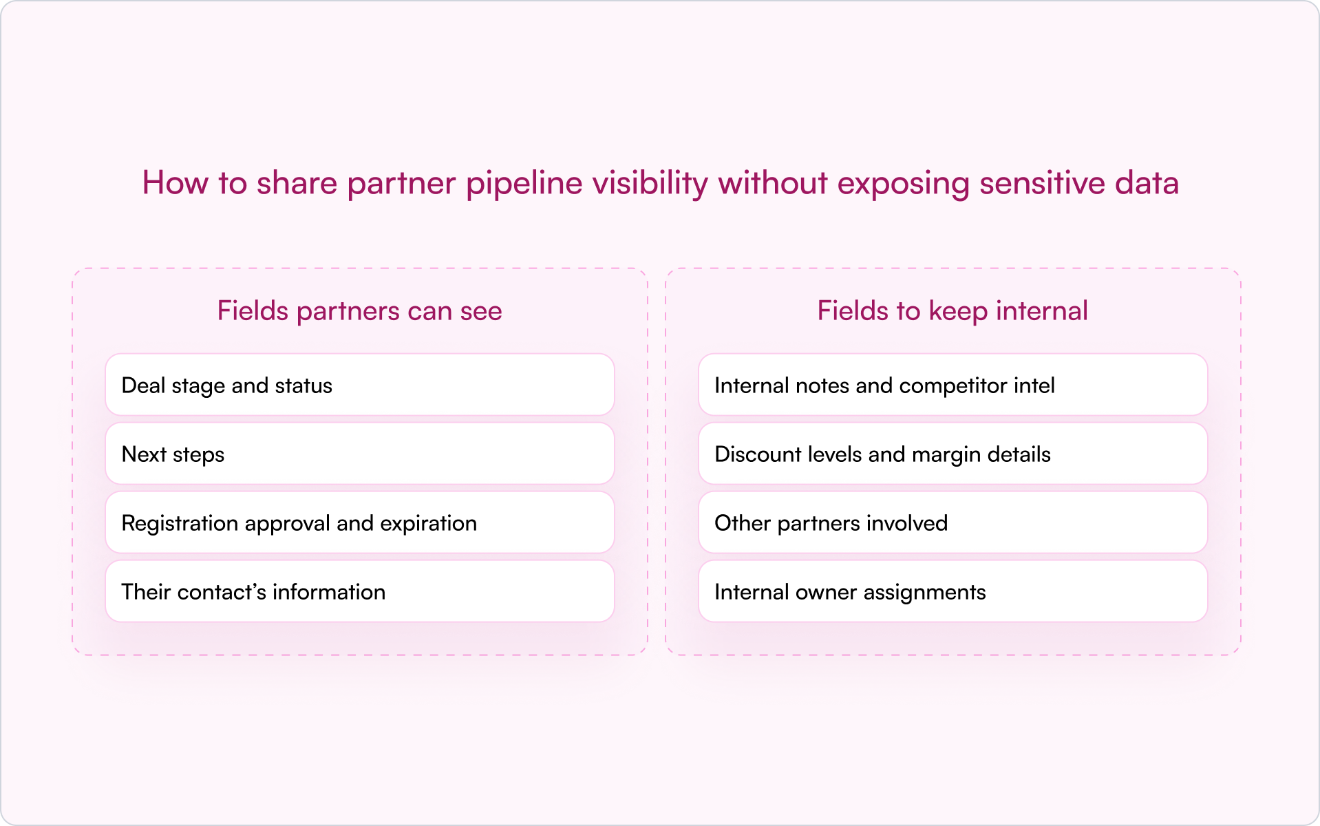 Shared pipeline views give partners visibility into their deals without exposing sensitive pricing or internal notes.
