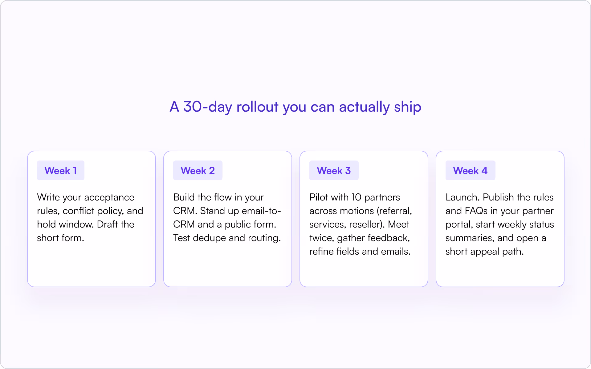Wählen Sie eine Reihe prägnanter Leistungskennzahlen aus, die sich auf die Ergebnisse beziehen: von Partnern bereitgestellte Pipeline, Zeit von der Registrierung bis zur Annahme, Stufenkonvertierung bei Co-Selling-Geschäften, durchschnittlicher Rabatt und Verlängerung oder Erweiterung bei gemeinsamen Konten. Überprüfen Sie diese wöchentlich intern und monatlich mit Ihren Partnern. Maßnahmen sind besser als Dashboards: Vereinbaren Sie eine Änderung pro Überprüfung und verfolgen Sie die Auswirkungen.