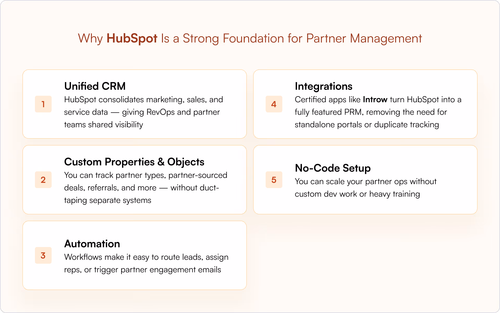 - Integrationen: Zertifizierte Apps wie Introw verwandeln HubSpot ein vollwertiges PRM, wodurch eigenständige Portale oder doppelte Nachverfolgung überflüssig werden.