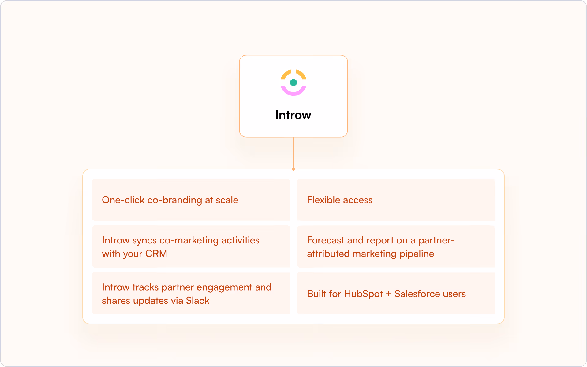 - Entwickelt für HubSpot Salesforce : Speziell für Markteinführungsteams konzipiert, die HubSpot oder Salesforce, fügt sich Introw nahtlos in Ihre bestehende Technologieumgebung ein und verbessert das Partnermarketing, ohne die Komplexität zu erhöhen.