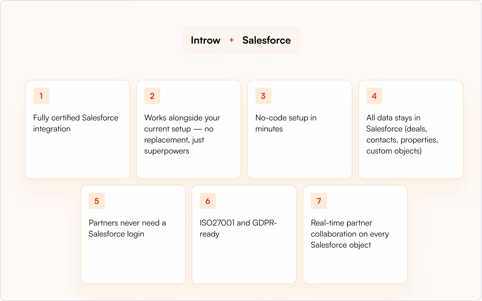 - Alle Daten bleiben in Salesforce Deals, Kontakte, Eigenschaften, benutzerdefinierte Objekte): Introw sorgt dafür, dass alle partnerbezogenen Daten in Ihrer Salesforce verbleiben, wodurch die Datenintegrität gewahrt bleibt und alle Informationen zentralisiert werden.
